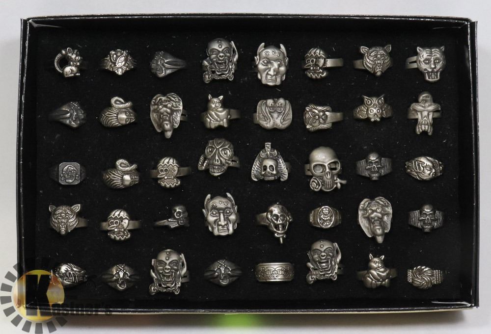 SKULL, SCARY CLOWN, SNAKES, GOTHIC THEMED, ETC.; VARIOUS SIZES; SOME ADJUSTABLE. JEWELLERY.