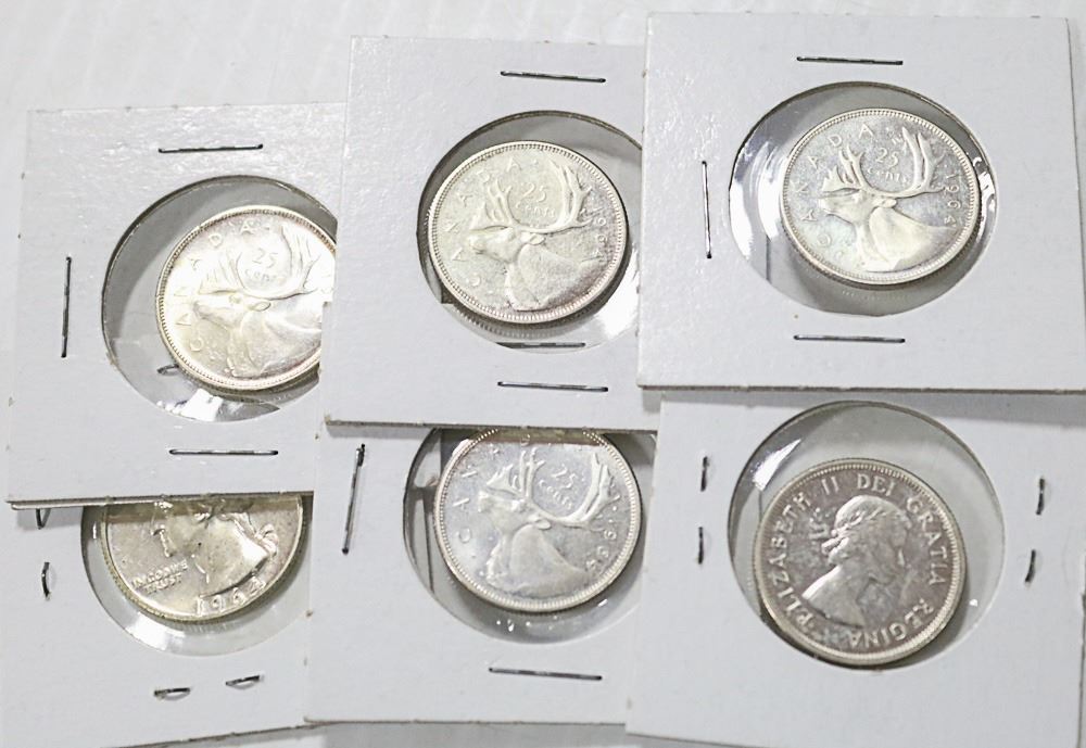 LOT OF 5 CANADIAN SILVER QUARTER, 1 USA QUARTER