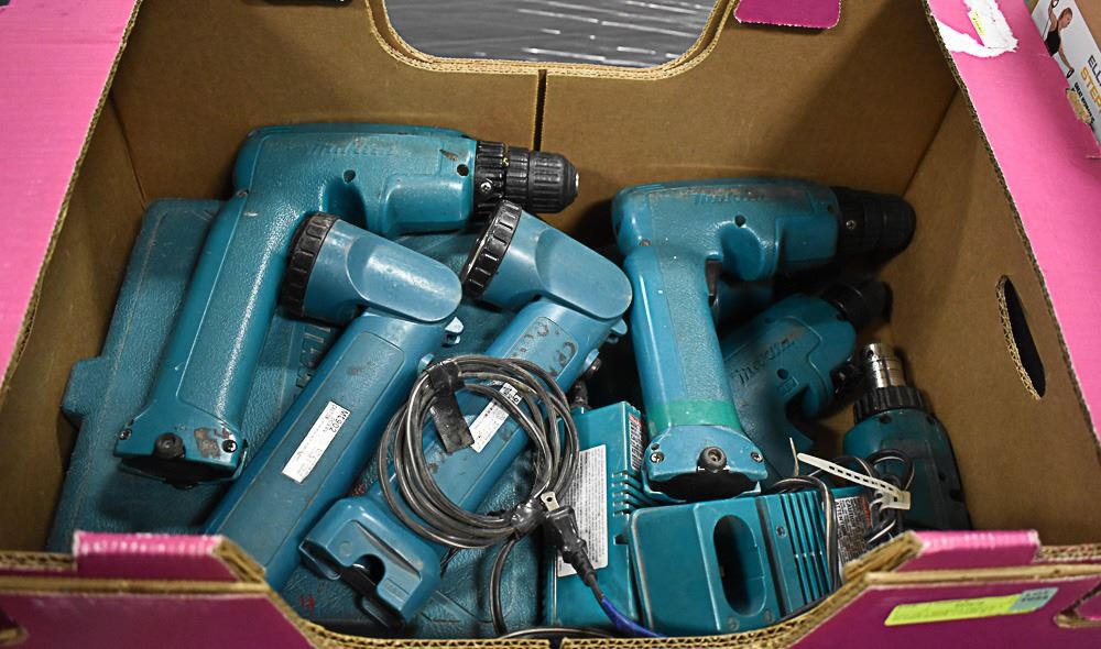 LOT OF 5 MAKITA DRILLS, 2 FLASHLIGHTS, 1 CASE & 2