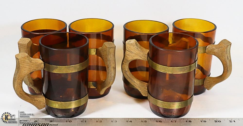 LOT OF 6 AMBER GLASS VINTAGE BEER STEINS