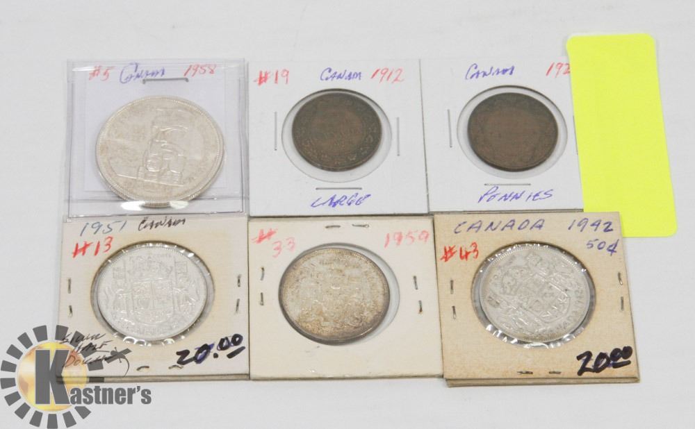 1912, 1920 LARGE PENNIES, 1959-50 CENT COIN, 1951 SILVER HALF DOLLAR. CURRENCY