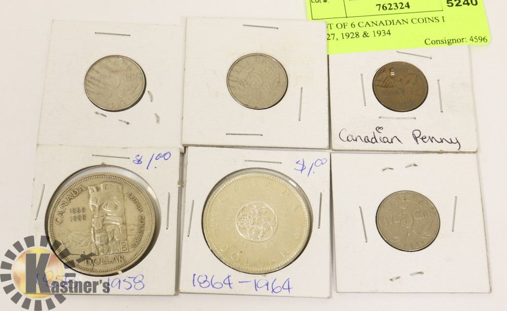 FIVE CENT COINS, 1938 PENNY, 1958 & 1964 DOLLARS. COLLECTIBLES