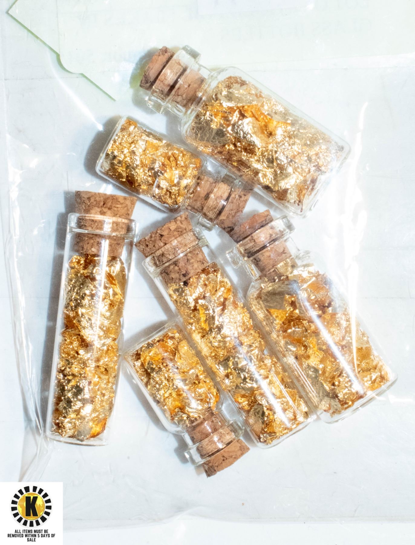 LOT OF 6 GOLD FOIL FLAKES IN GLASS BOTTLES