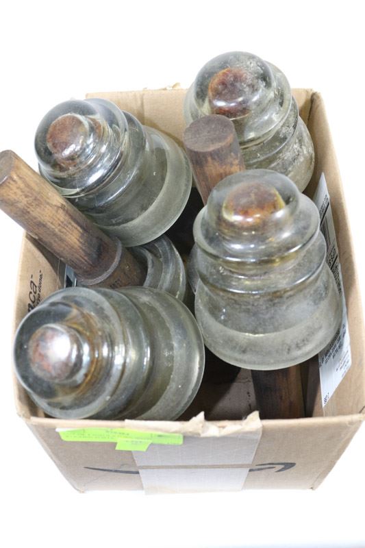 LOT OF 6 INSULATORS WITH WOODEN POSTS