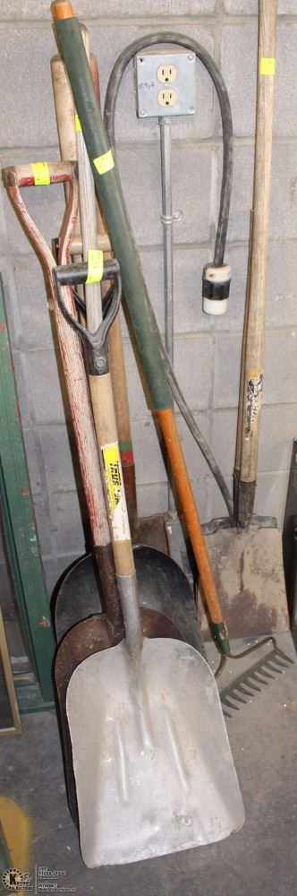 LOT OF 7 METAL SHOVELS & 1 METAL RAKE
