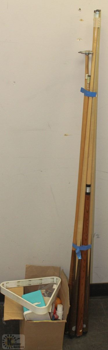 LOT OF 7 POOL CUES, 1 REST, 2 SETS OF BALLS, AND