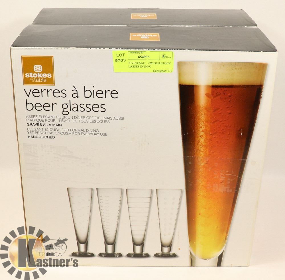 LOT OF 8 VINTAGE NEW OLD STOCK BEER GLASSES IN BOX