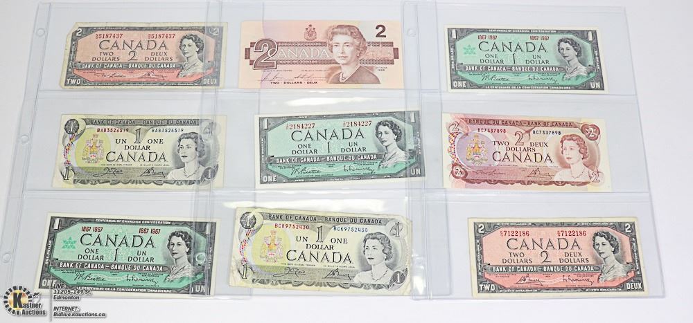 LOT OF 9 OLD CANADA $1 & $2 BANK NOTES