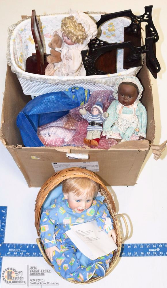 DOLL BASSINET ON WHEELS, DOLLS ARE: BABY MICKEY ASHTON DRAKE YOLANDA BELLO DOLL WITH BLANKET, DANIELLE BY YOLANDA BELLO FOR ASHTON DRAKE (NO COA), 19" DUCK HOUSE HEIRLOOM DOLL VICTORIA 579/5000, AND MORE.COLLECTIBLES
