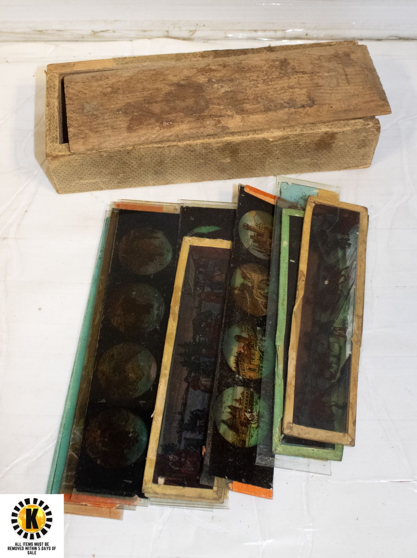 LOT OF ANTIQUE COLOURED GLASS LAMP SLIDES IN BOX