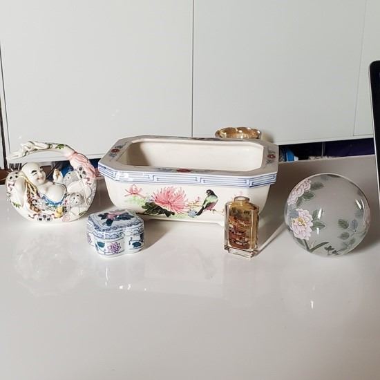 1X CARVED RESIN PLASTIC ROUND HAPPY BUDDHA FIGURE 1X REVERSE PAINTED SNUFF BOTTLE (NO LID) 1X REVERSE PAINTED QUAIL BALL 1X SMALL CERAMIC ASIAN TRINKET BOX. PEACHES & FLORAL DETAIL1X VINTAGE HAND PAINTED PORCELAIN BONSAI POT