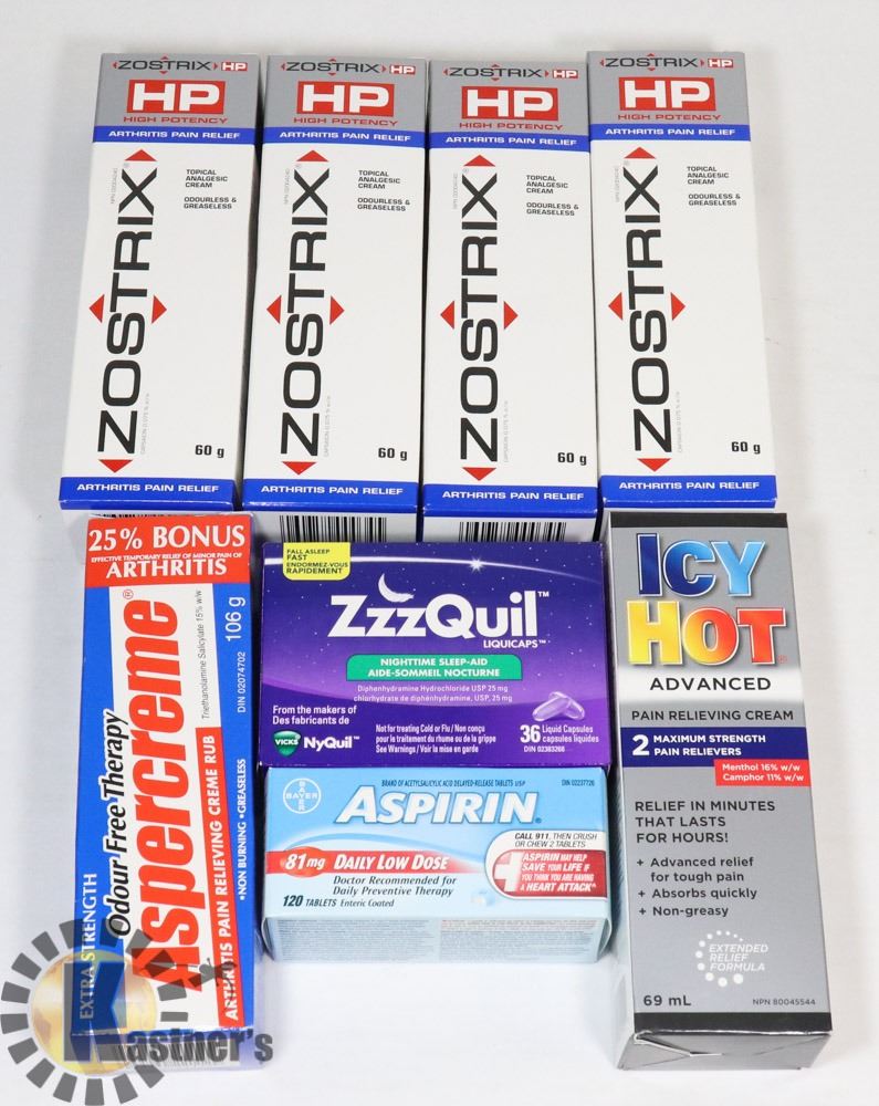 LOT OF ASPRIN NYQUIL, AND ZOSTRIX.