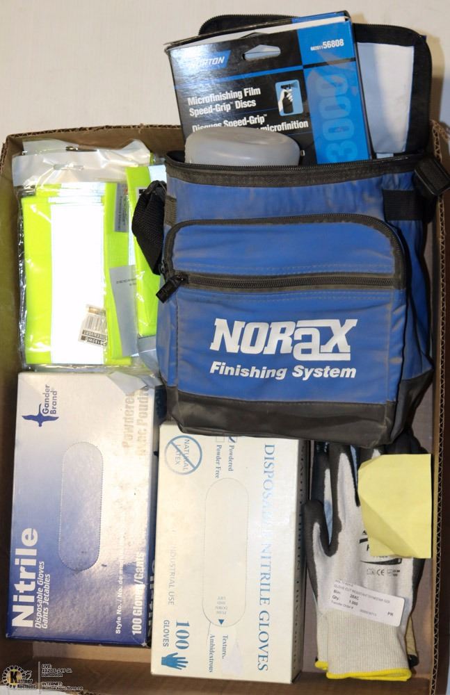 VIKING REPLACEABLE SAFETY BANDS, 2 BOXES 100 NITRILE GLOVES AND PAIRS OF PVC COATED WORK GLOVES (SIZES 8 AND 10), BLUE LUNCH BAG WITH FINISHING DISCS