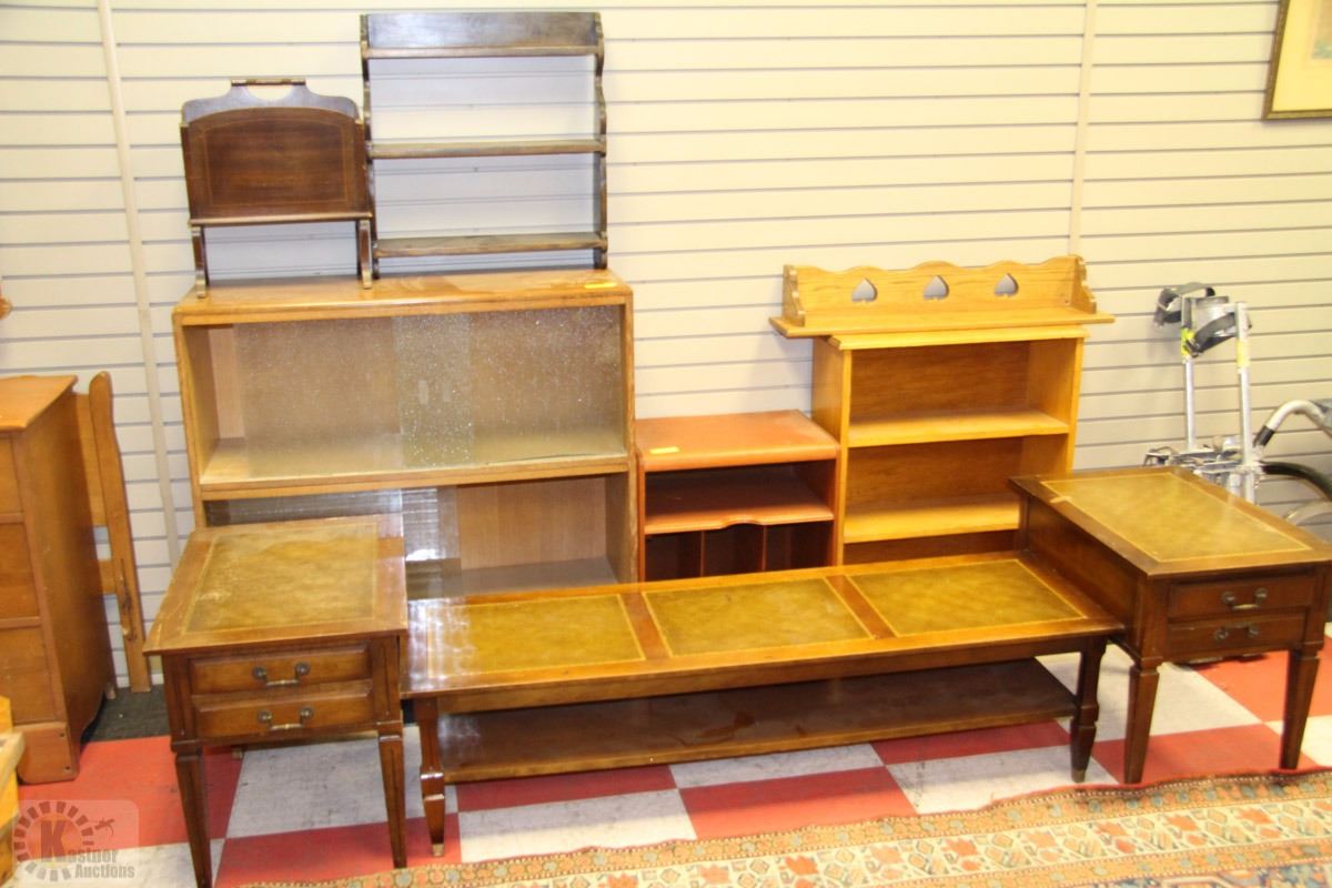 WOODEN CABINET, 41"X16"X24"H, COFFEE TABLE SET , TELEPHONE TABLE ,WOODEN HEART SHELF, BOOK SHELF AND MORE