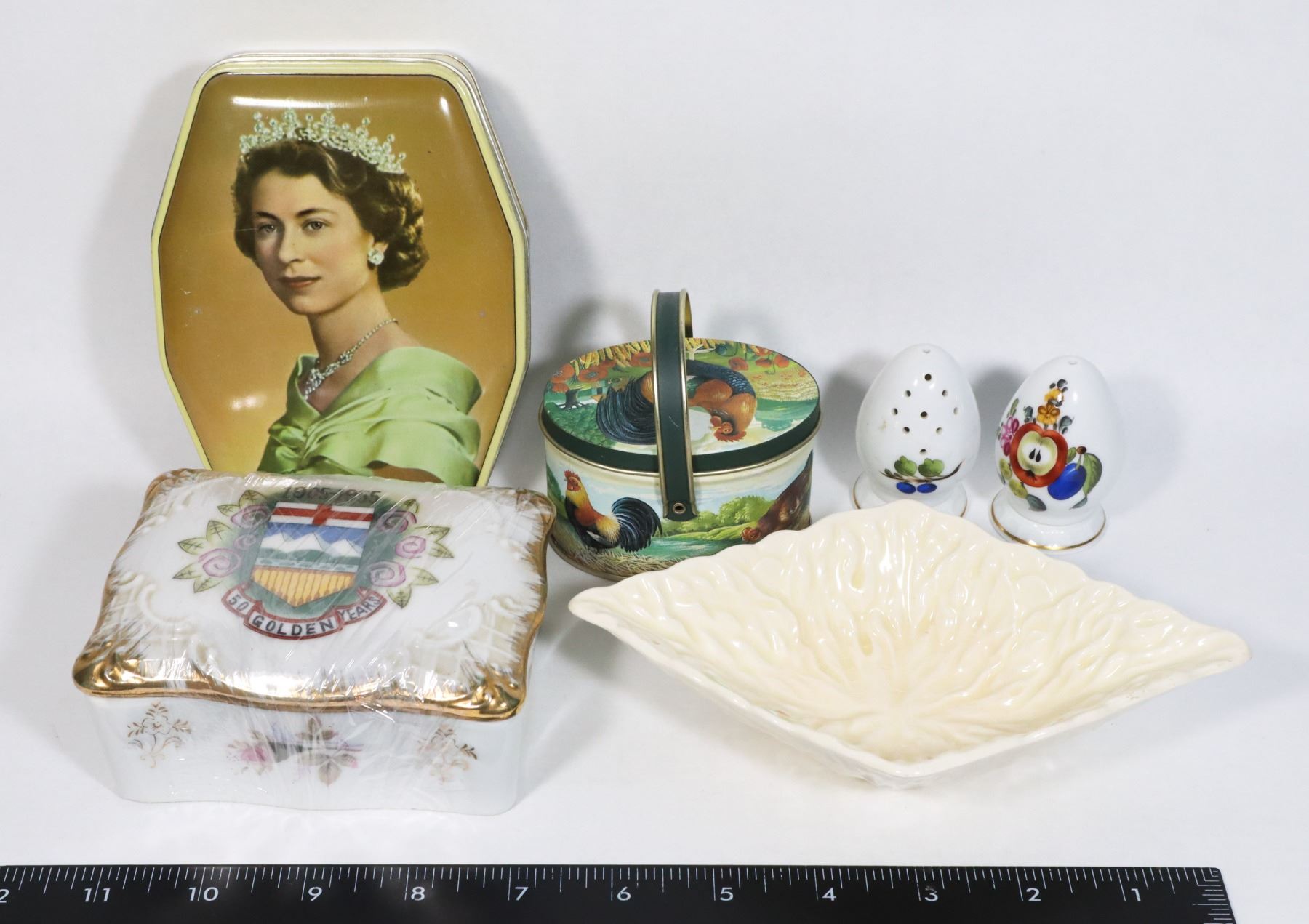 LOT OF ASSORTED ITEMS INCLUDES QUEEN ELIZABETH TIN