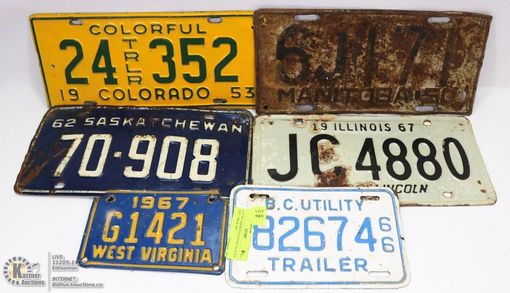UTILITY TRAILER PLATES, COLORADO 53, MANITOBA 1950, SASKATCHEWAN 1962, 1967 ILLINOIS. COLLECTIBLES.