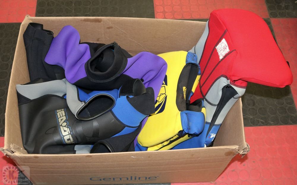 LOT OF ASSORTED LIFE JACKETS AND WETSUITS