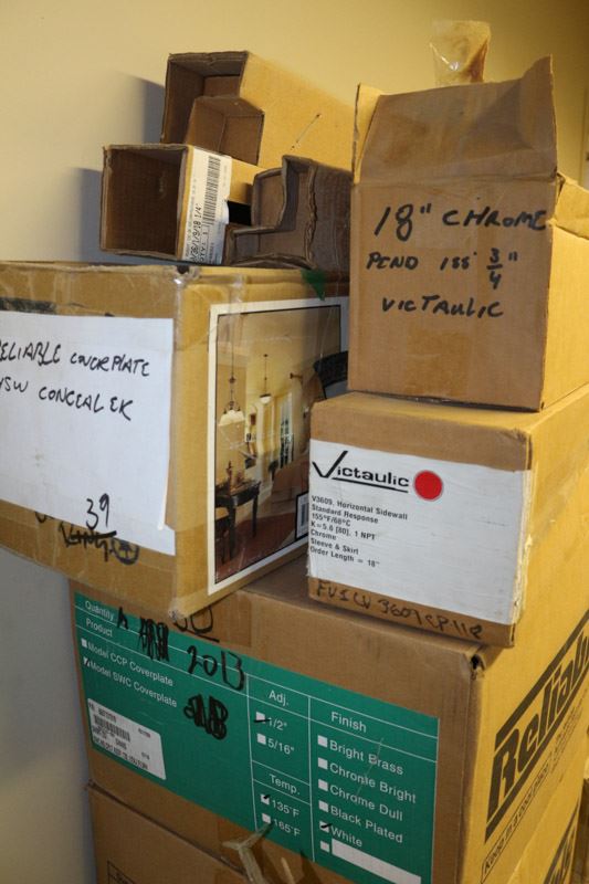 QTY.1:16 1/4" 155° DRY PENDENT HEAD, QTY.1:18 1/4" 155° DRY PENDENT HEAD, QTY.3:18" 155° STANDARD RESPONSE DRY SIDEWALL HEAD, QTY.26 -1 /2" WHITE DOMED CONCEALER COVERPLATE, QTY.28 - 1 /2" WHITE FLAT CONCEALER COVERPLATE, 400PC. 1 /2" WHITE 2 PIECE ESCUTCHEON, 100PC. F1RES44 155° SPRINKLER HEAD, 188PC. 1 /2" MODEL G/F1 WHITE RECESSED ESCUTCHEON, 103PC. RFC43 165* HEADS, 1PC. 18 3/4" 155° QUICK RESPONSE DRY PENDENT HEAD, 2PC. 18" 155° STANDARD RESPONSE DRY SIDEWALL HEAD, TOTAL APPROX WHOLESALE COST - $3353.00