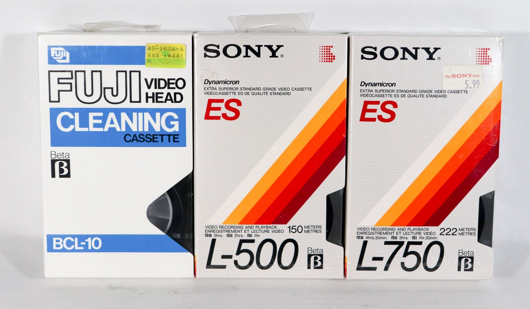 2 SONY DYNAMICRON ES L-750 VIDEO RECORDING VHS AND FUJI VIDEO HEAD CLEANING CASSETTE.