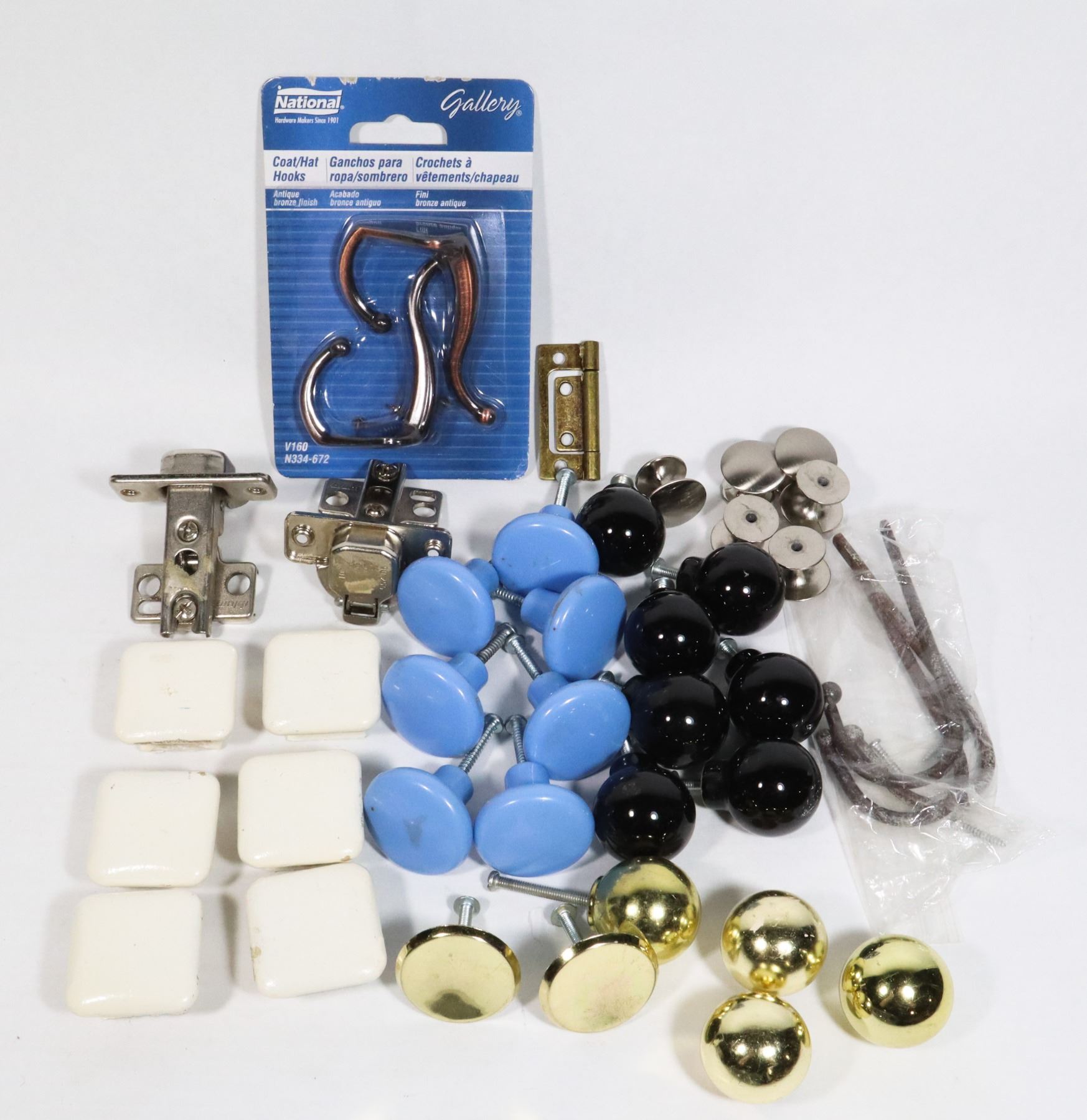 LOT OF CABINET KNOBS, DOOR HOOKS, CABINET HINGES
