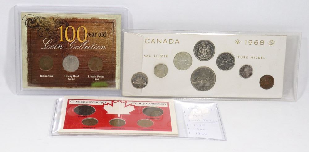 COIN SET, CANADA SOVEREIGN PENNY COLLECTION, AND 100 YEAR OLD COIN COLLECTION. CURRENCY