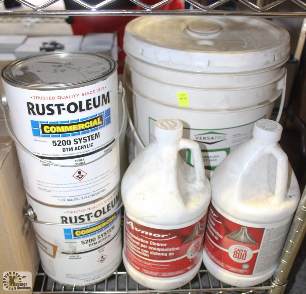 TWO 1 GALLON JUGS OF AVMOR ENCAPSULATION CLEANER, TWO JUGS OF LPS T-91 NON-SOLVENT DEGREASER, TWO 1 GALLON PAILS OF RUSTOLEUM 5200 DTM ACRYLIC, & 20 LITRE PAIL OF VERSAPRO CARNAUBA HOT WAX