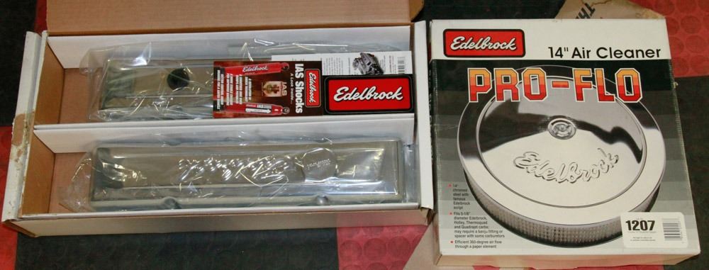 CHROME VALVE COVERS (WITH FEL PRO GASKETS)AND 14" EDELBROCK CHROME AIR CLEANER. FITS CHEVY V8 1959-86. AUTO