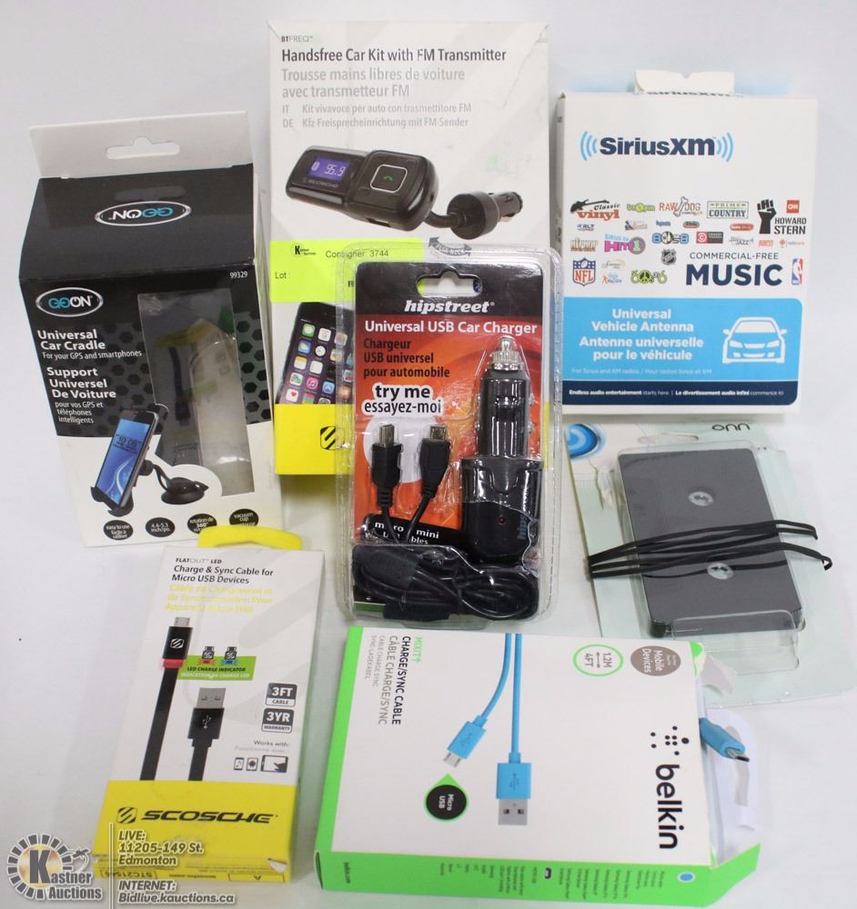 UNIVERSAL CAR CRADLE, BELKIN CHARG/SYNC CABLE, BLUETOOTH HANDSFREE CAR KIT WITH FM TRANSMITTER, CHARGE & SYNC CABLE, UNIVERSAL USB CAR CHARGER
