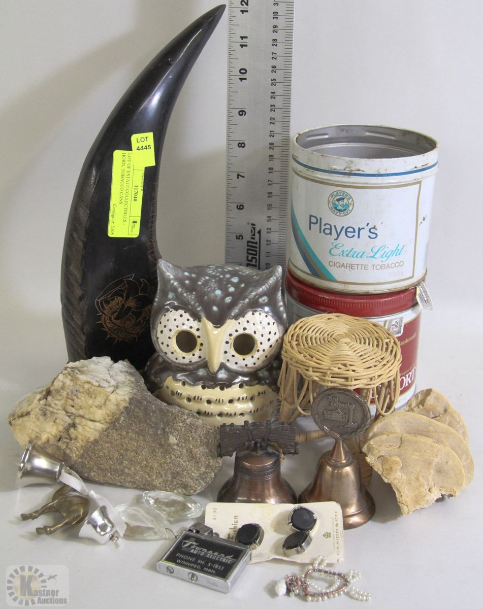 LOT OF ESTATE COLLECTIBLES - HORN, TOBACCO CANS