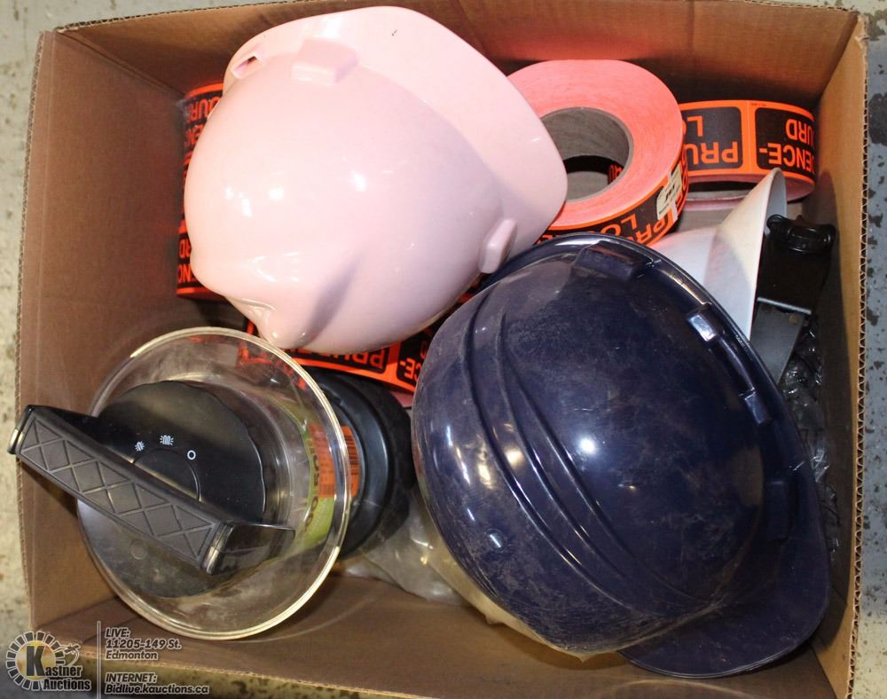 *TAPE IS IN FRENCH, AND LANTERN IS MISSING BOTTOM TO HOLD BATTERIES, HARDHATS HAVE LINERS**