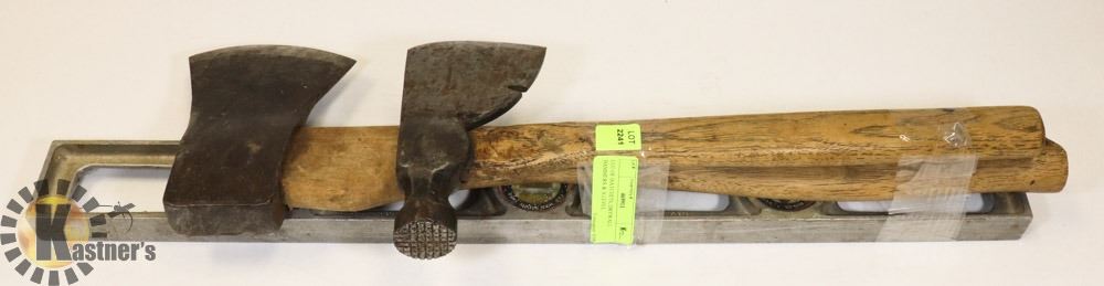 LOT OF HATCHETS, DRYWALL HAMMERS & A LEVEL