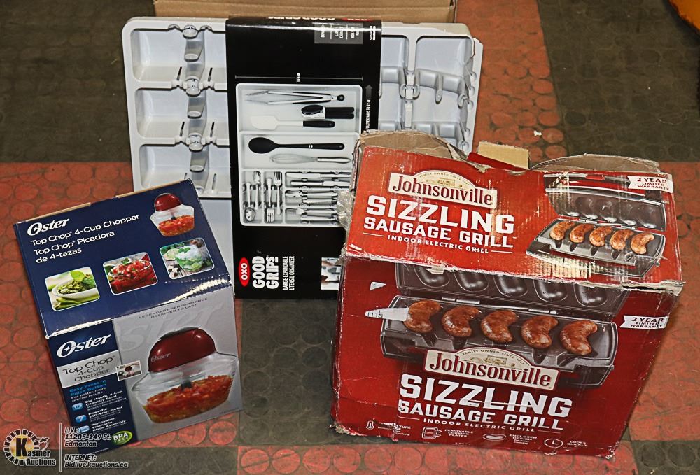 SAUSAGE COOKER, SALSA MAKER, AND EXPANDABLE UTENSIL TRAY ALL ITEMS NEW -HOME