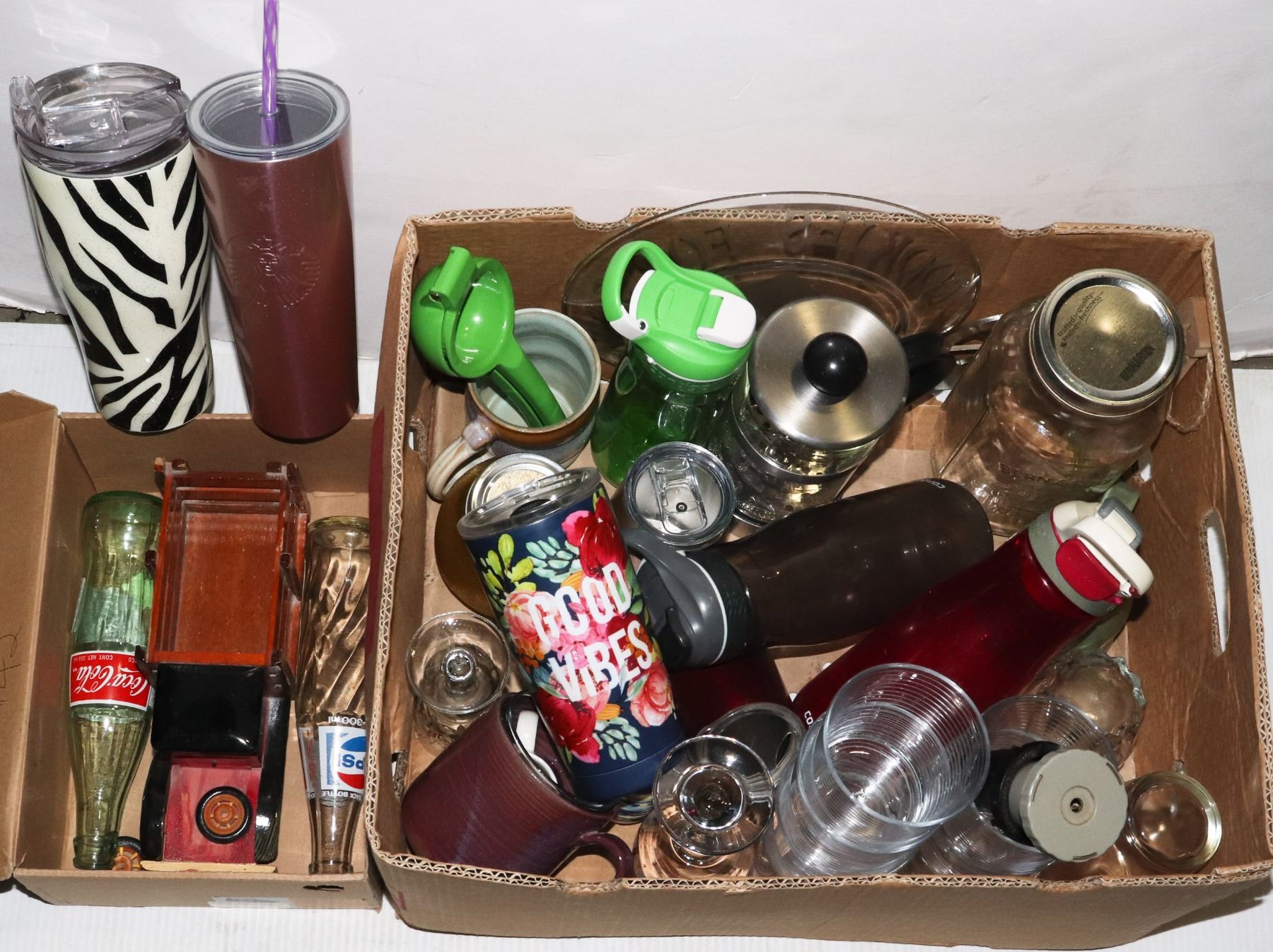 TRAVEL CUP , VINTAGE TRUCK WITH GLASS COCA COLA AND PEPSI BOTTLES, WATER BOTTLES , GLASS CUPS AND MORE
