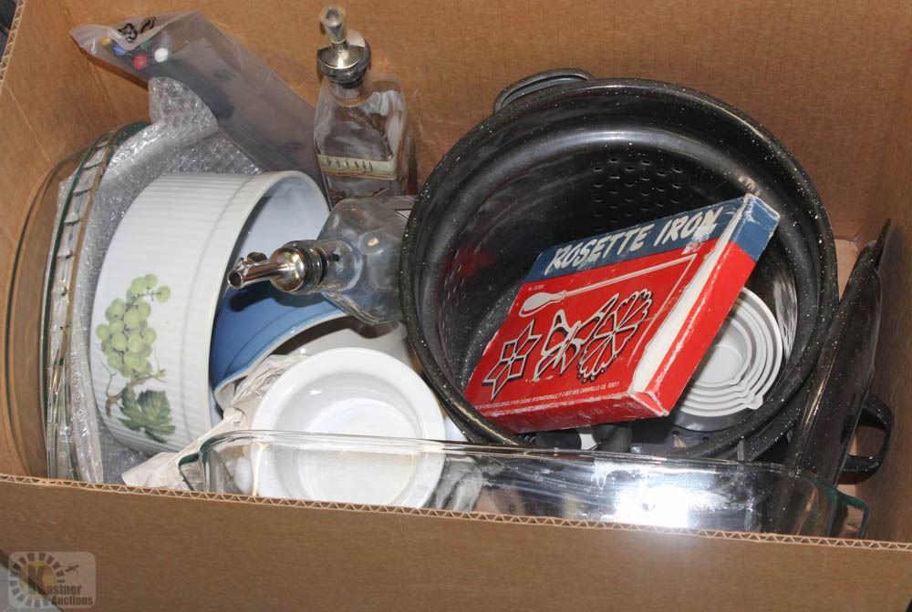 PYREX GLASS DISHES, STEAMER POT, ROSETTE IRON