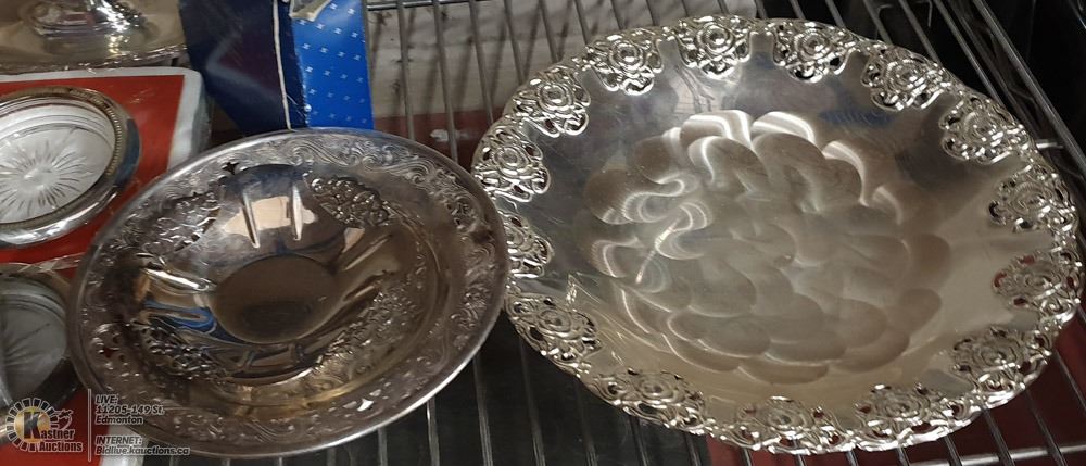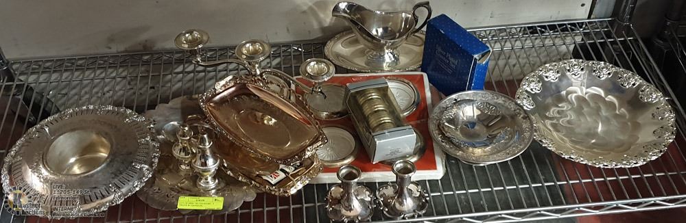 SMALL TRAY W/ HANDLE, CANDELABRA, 2 CANDLE HOLDERS, DESSERT STAND, CANDY DISH, DESSERT DISH, GRAVY BOAT, DESSERT DISH W/ HANDLE, 4 SILVER & GLASS COASTERS, 4 NAPKIN RINGS, 6 SILVER COASTERS - HOME