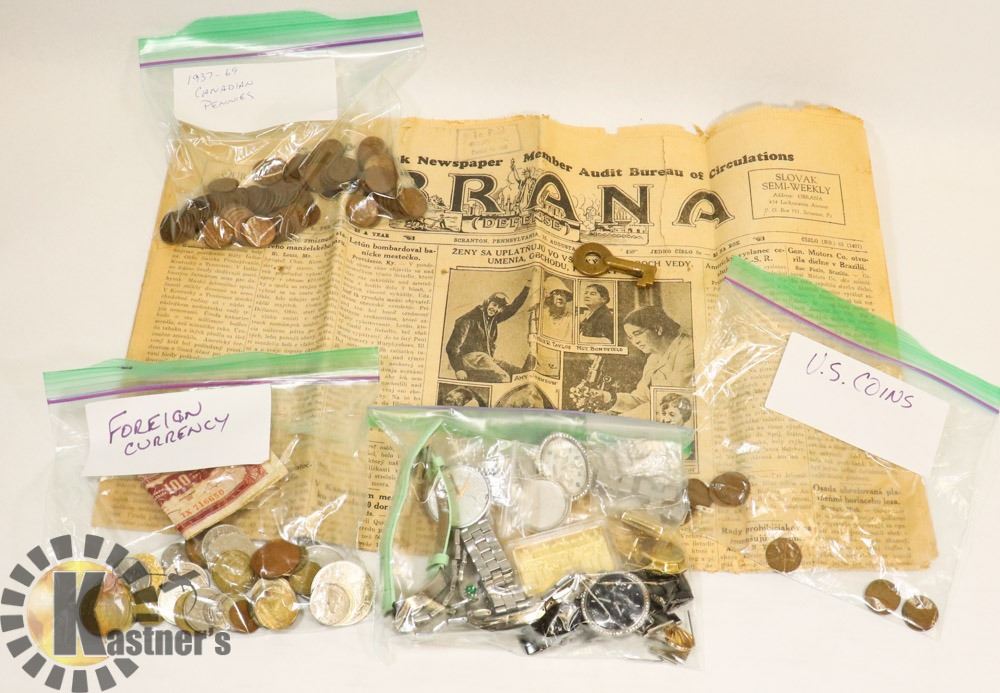 FOREIGN COINS FROM 1937 AND UP, MISCELLANEOUS WATCH PIECES, 1932 SLOVAKIAN NEWSPAPER AND VINTAGE C.N. KEY