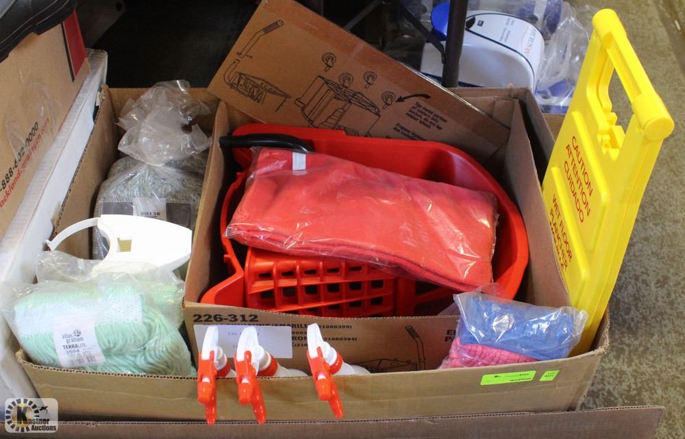 25 LITER RED CONTINENTAL MOP BUCKET WITH WRINGER, DUST MOP HEADS, WET FLOOR SIGN & MORE