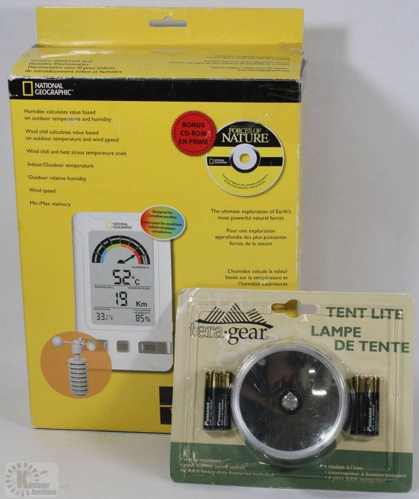 NEW NATIONAL GEOGRAPHIC WIRELESS WINDCHILL AND HUMIDEX THERMOMETER AND NEW TERA GEAR TENT LITE