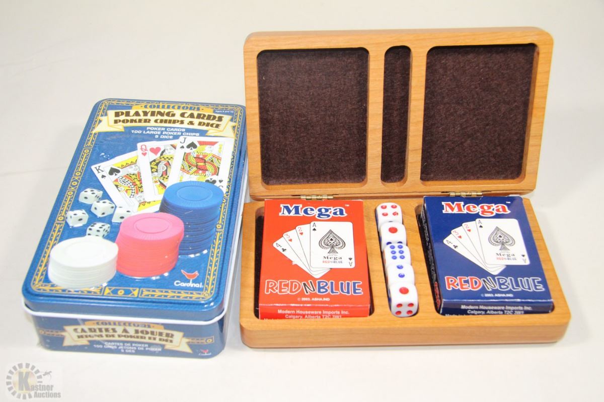 A WOODEN CASE WITH CARDS AND DICE
