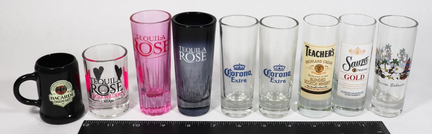 LOT OF SHOT GLASSES INCLUDES TEQUILA ROSE GLASSES,