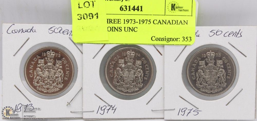 LOT OF THREE 1973-1975 CANADIAN 50 CENT COINS UNC