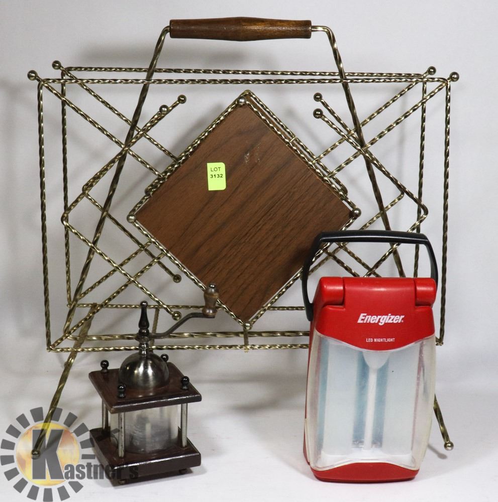 VINTAGE BRASS MAGAZINE STAND, TABLE TOP GRINDER AND ENERGIZER EMERGENCY LIGHT (WORKING WITH BATTERY), FROM BARN/ACREAGE ESTATE - HOUSEHOLD