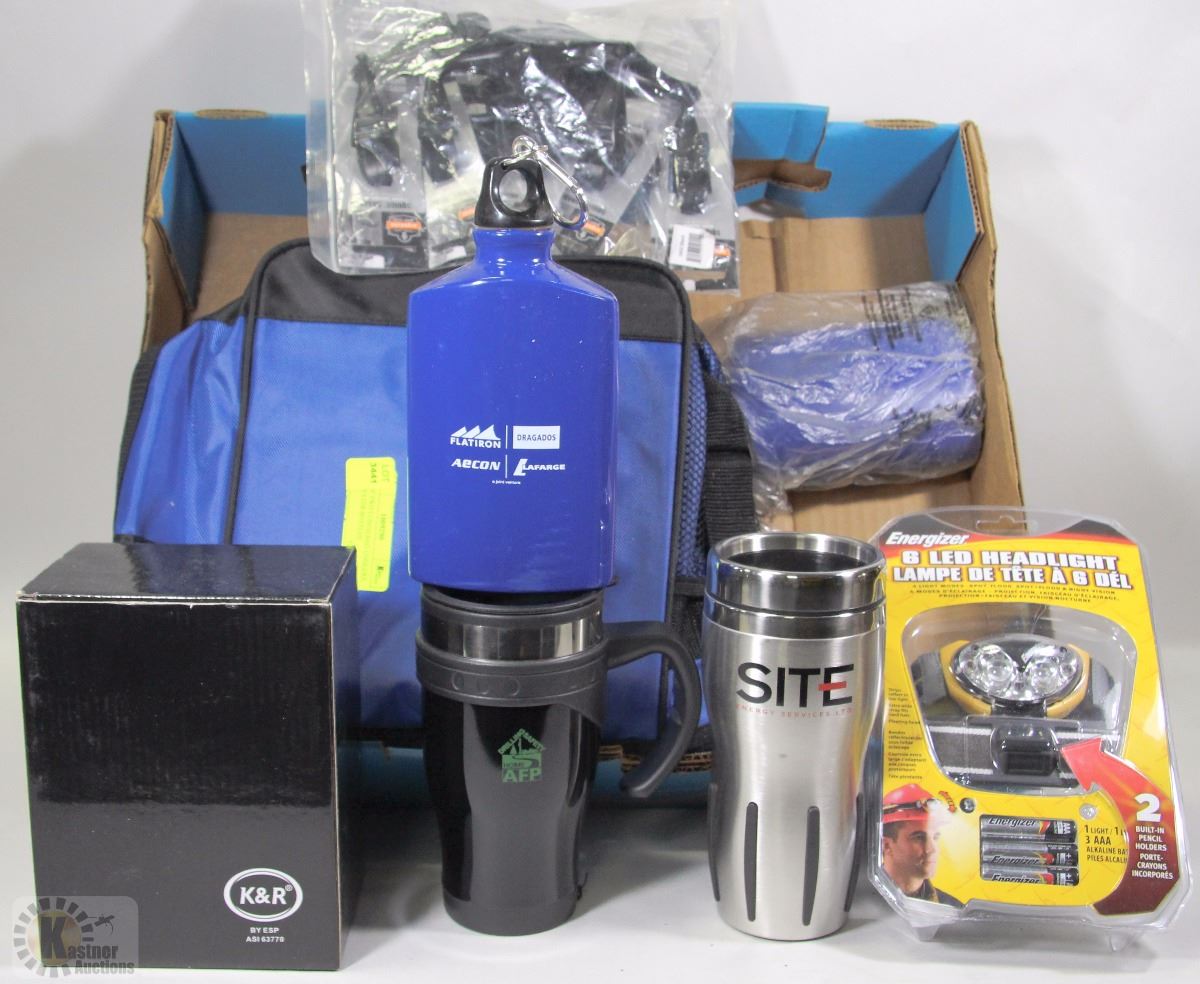 THREE COFFEE THERMAL MUGS, HELMET LIGHT, & SIX GRABBERS
