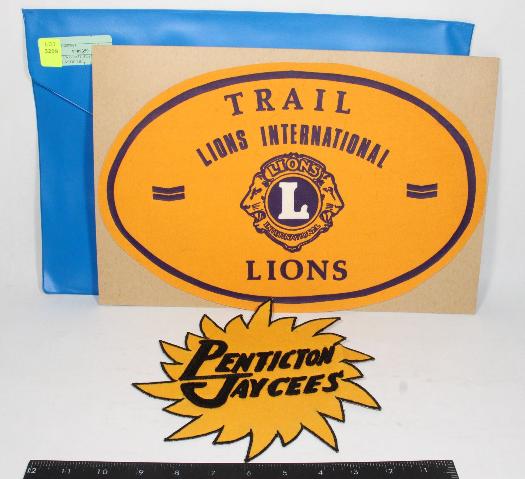 HOLDED. TRAIL LIONS INTERNATIONAL PATCH APPROX. 9"X 14", PENTICTON JAYCEES PATCH APPROX. 7"X8". FILE FOLDER APPROX. 10.5"X15.5"