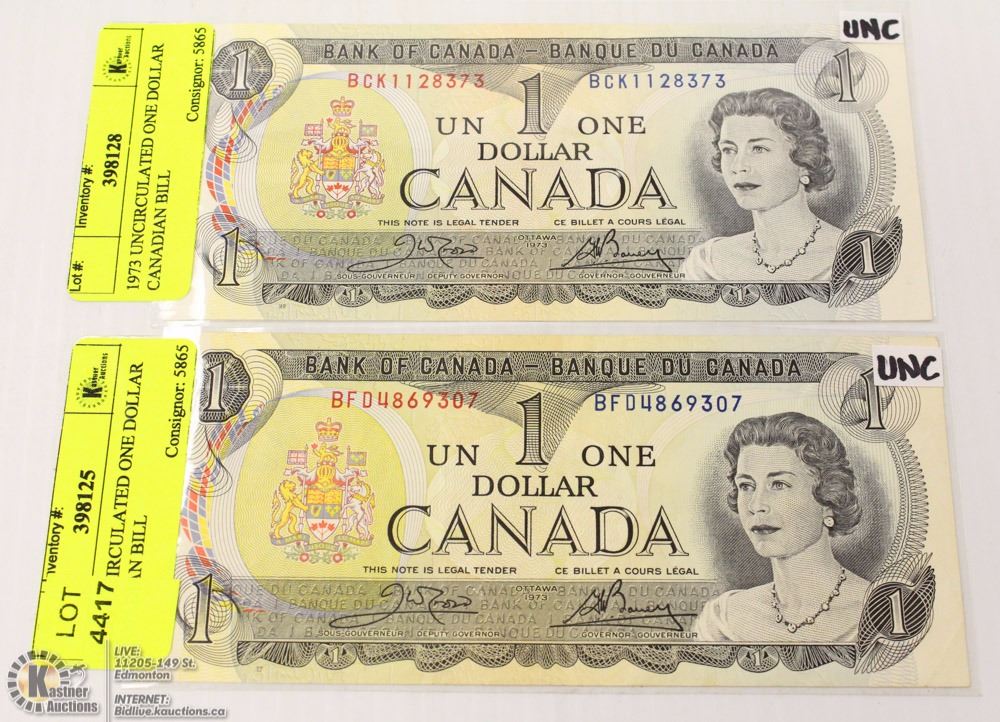 LOT OF TWO UNCIRCULATED 1973 CANADIAN $1 BANK NOTE
