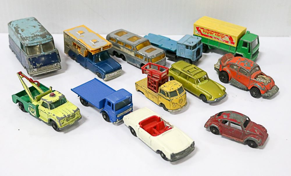 LOT OF VINTAGE TOY CARS INCL. CORGI, LESNEY & MORE