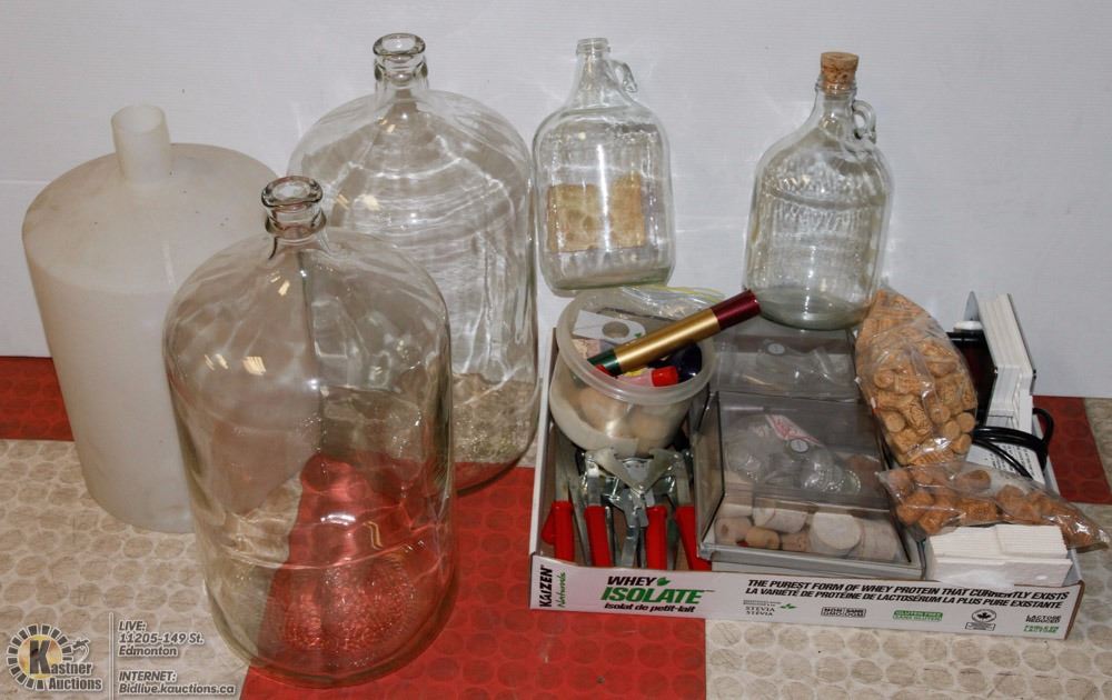 GLASS BOTTLES, FLAT OF CORKS & ACCESSORIES, 2 SMALL GLASS JUGS AND 1 LARGE PLASTIC JUG