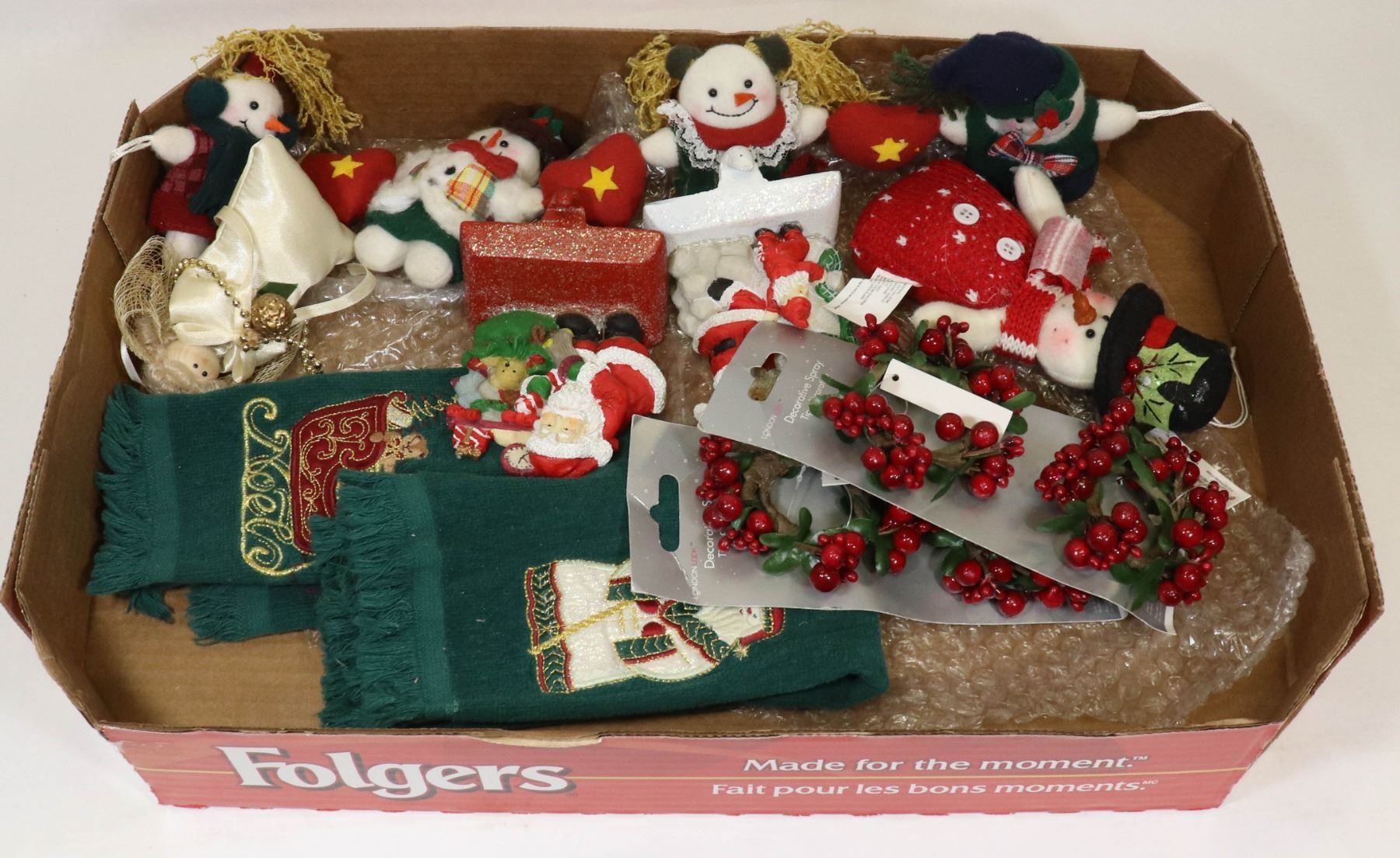 CHRISTMAS TOWELS, STRING OF PLUSH SNOWMEN, 2 NEW SETS OF CRANBERRY NAPKIN/CANDLE HOLDERS AND MISC DECOR. SEASONAL