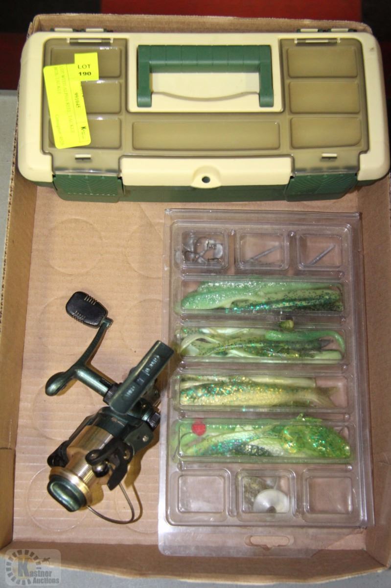 LOT WITH ALPHA REEL, TACKLE BOX, TACKLE
