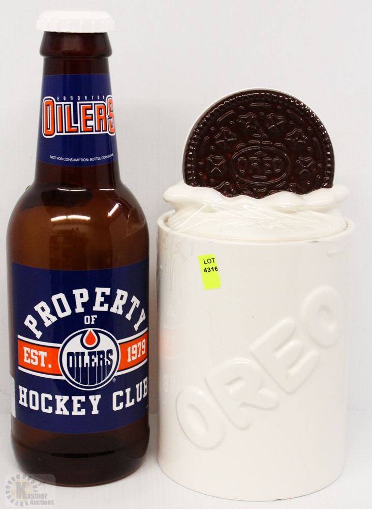 LOT WITH OREO COOKIE JAR AND OILERS PIGGY BANK